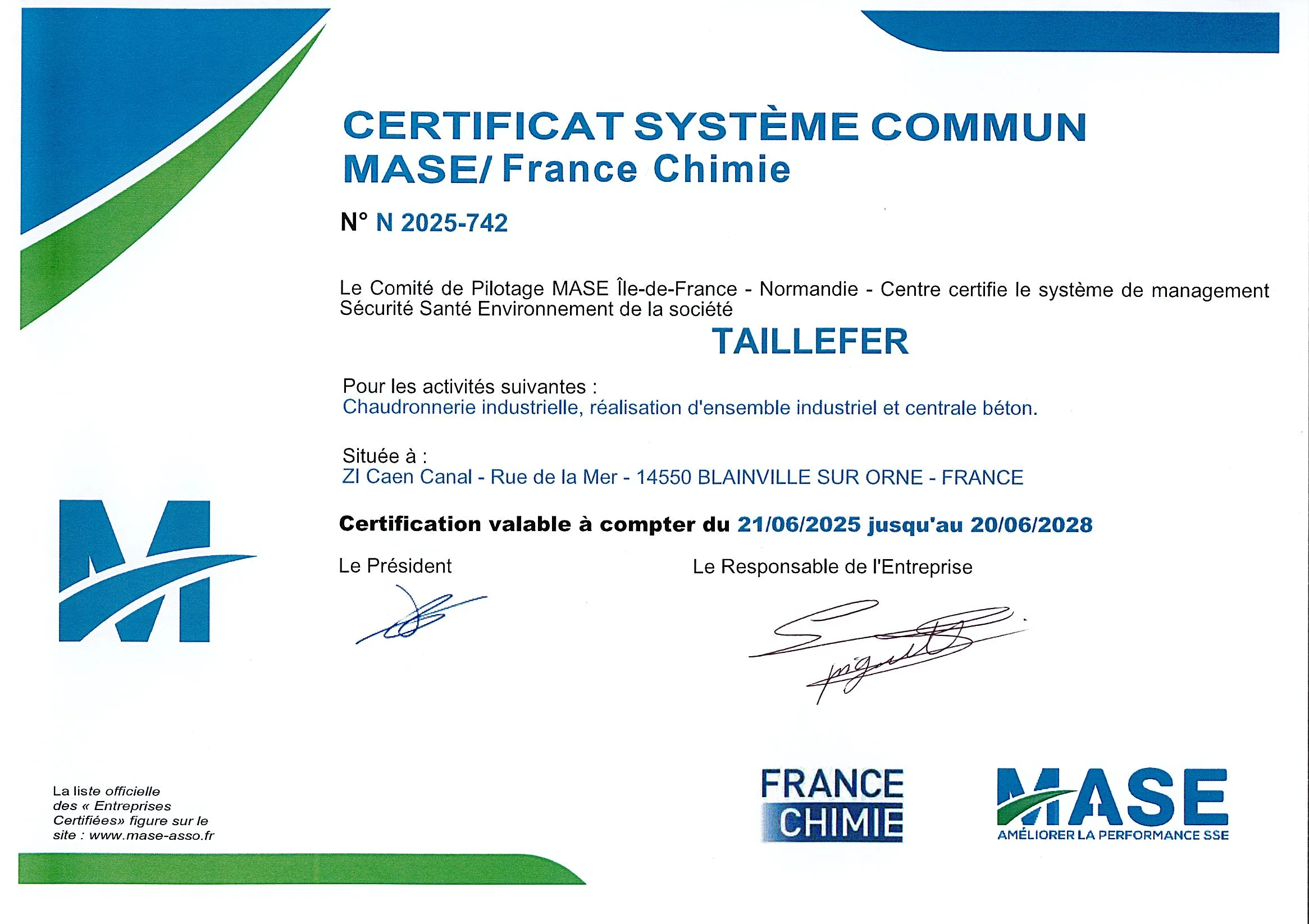 Engagé dans le MASE depuis 2009, TAILLEFER a obtenu le renouvellement de sa certification pour 3 ans jusqu’en juin 2028.