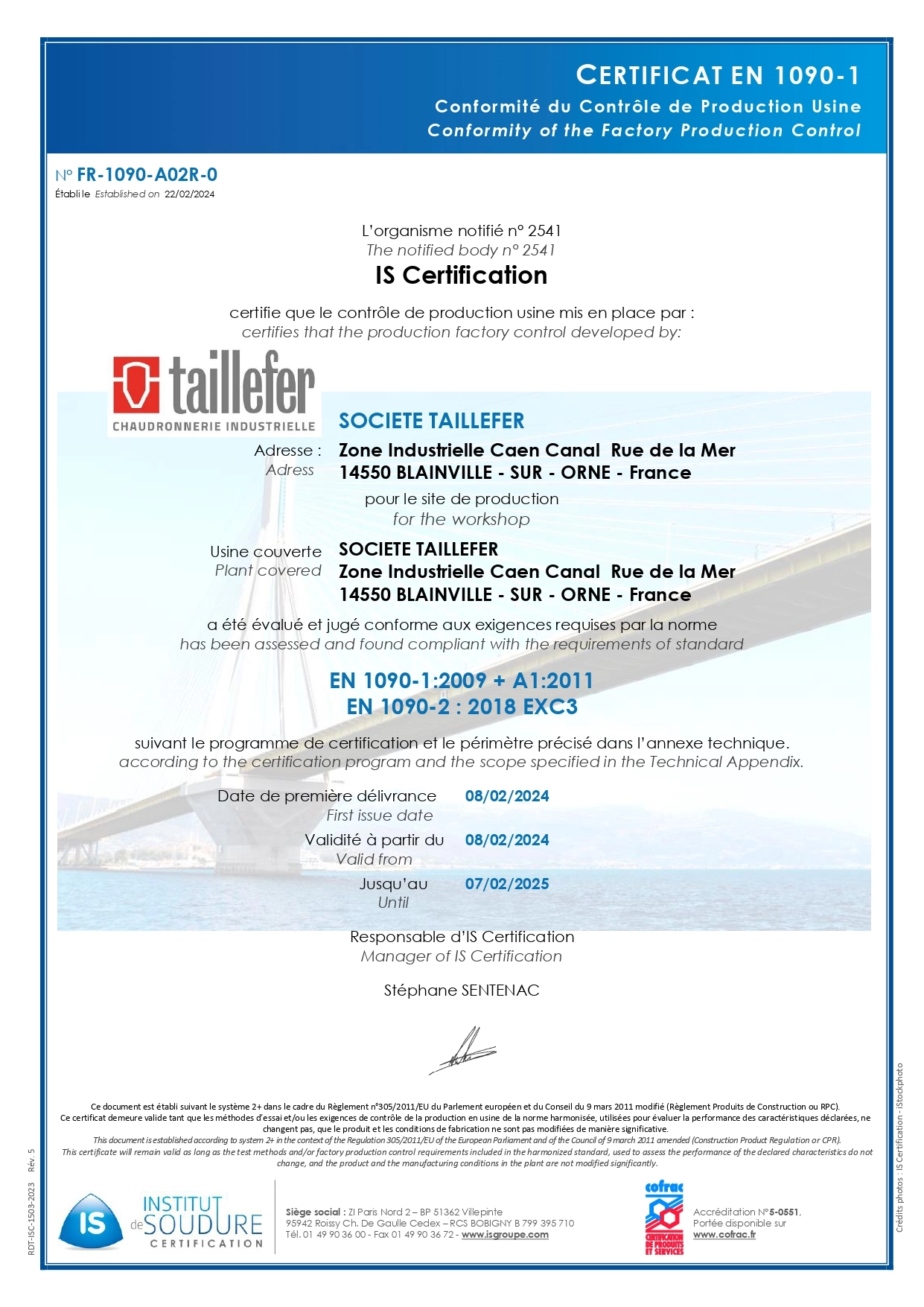 Début février 2024, TAILLEFER a obtenu la certification EN 1090 -1.